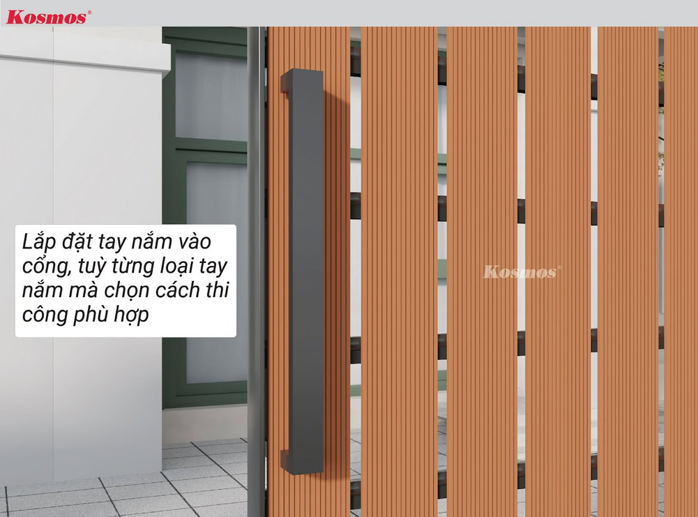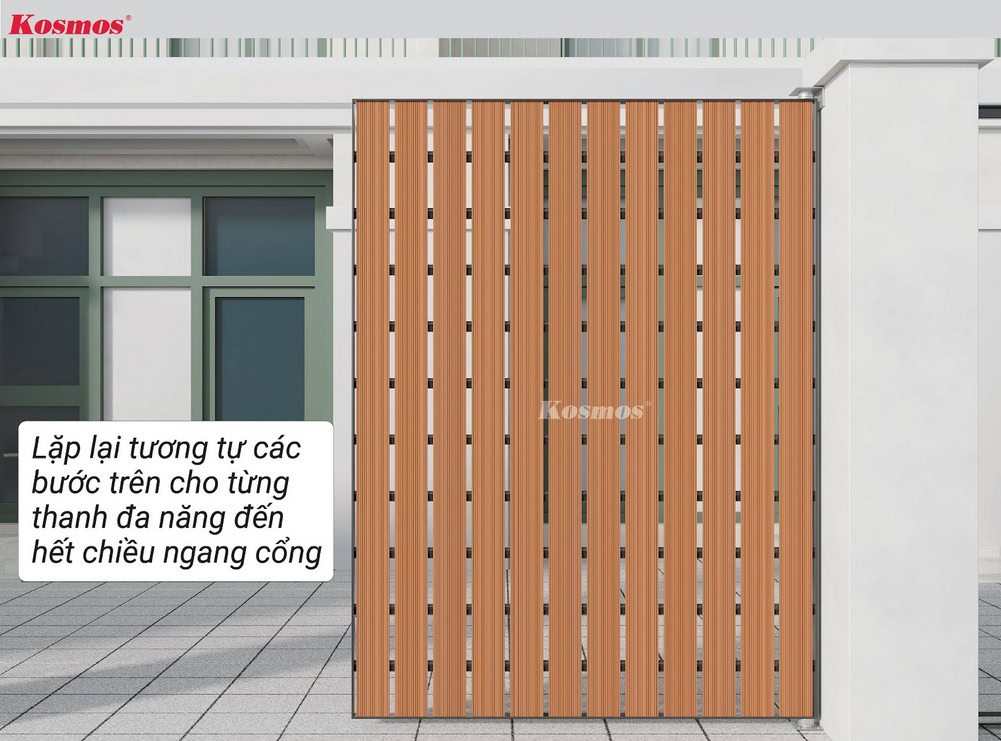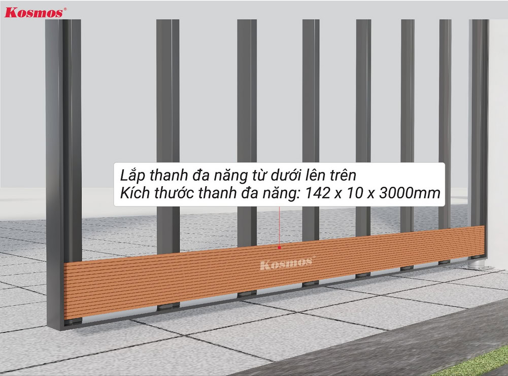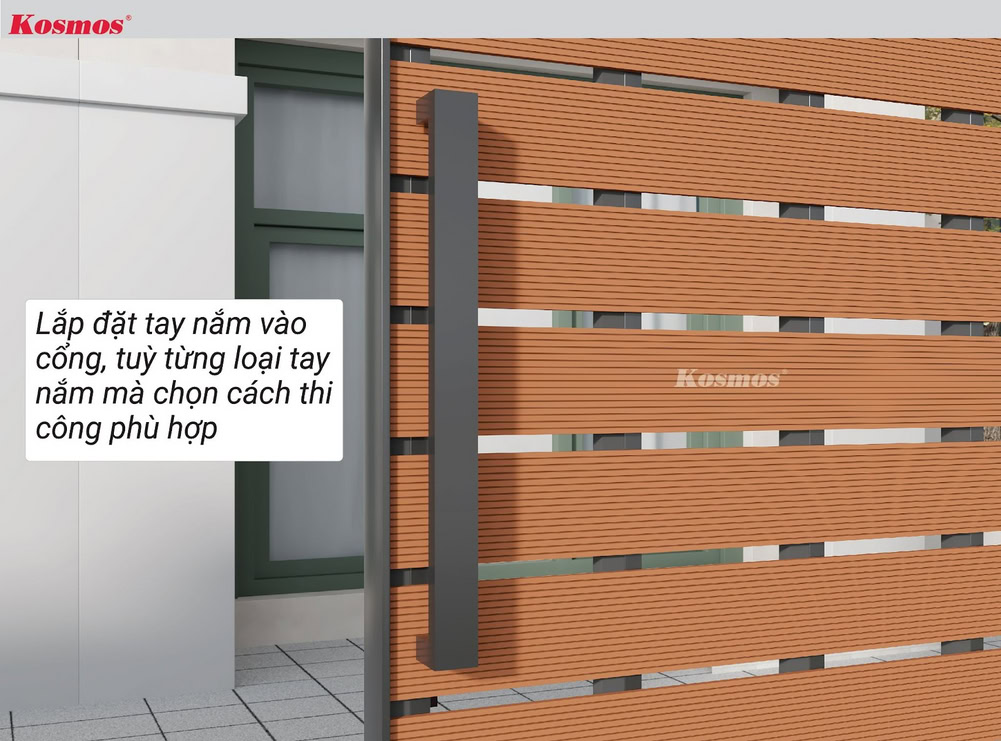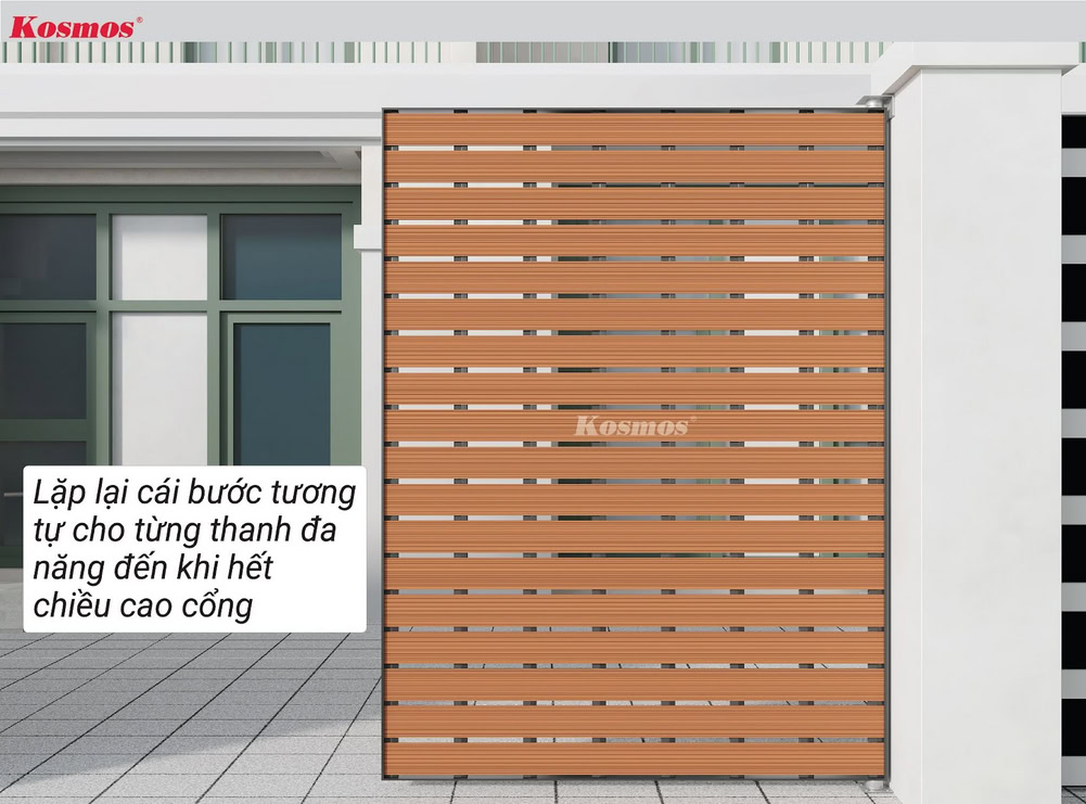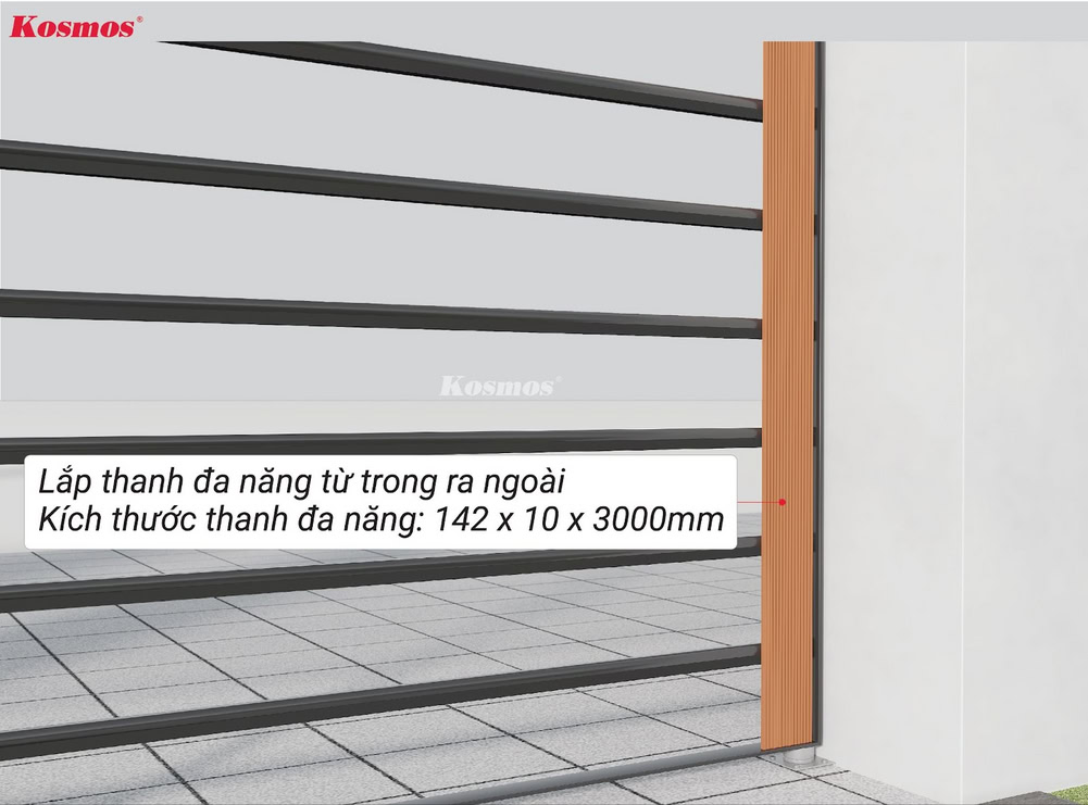 Lưu ý: Cổng là khu vực thường xuyên tiếp xúc với nắng Kosmos khuyến cáo sử dụng mặt sọc của thanh đa năng tiếp xúc phía ngoài cổng thay vì sử dụng mặt vân gỗ.