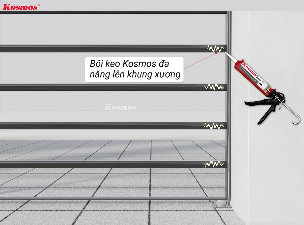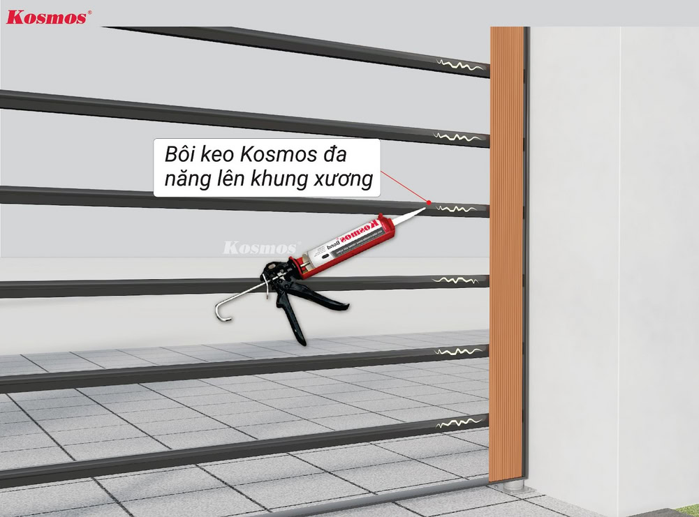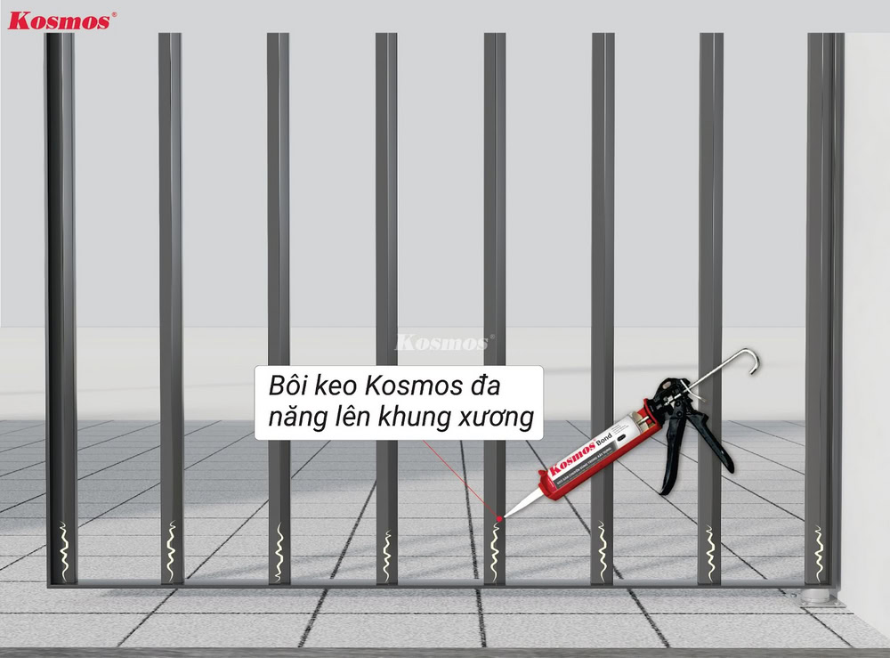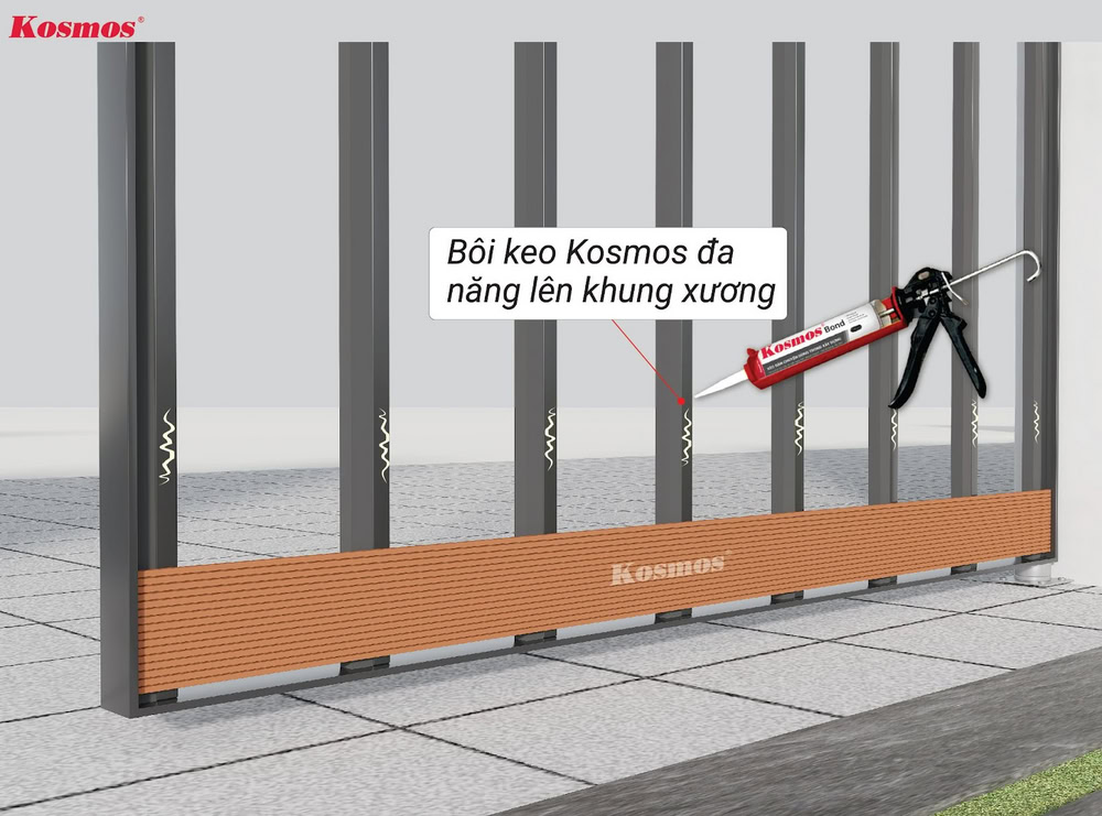 1. Bôi keo Kosmos đa năng vào khung xương và thanh gỗ đã cố định trên khung xương.