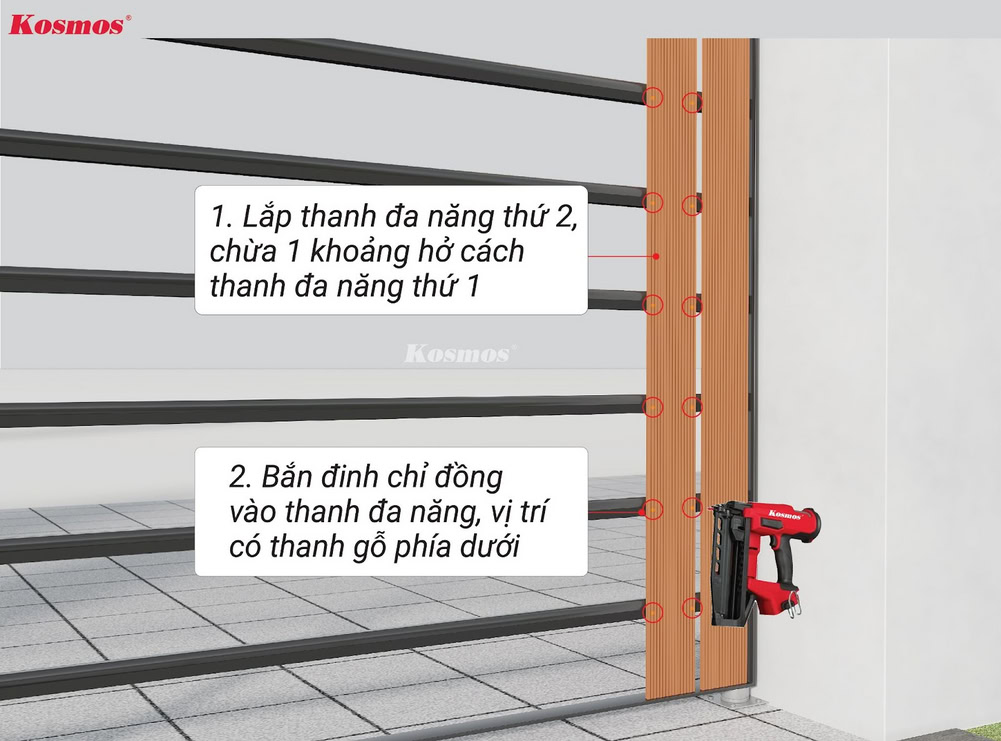 3. Dùng súng bắn đinh kèm đinh chỉ đồng bắn vào thanh đa năng để cố định với khung xương ở vị trí các thanh gỗ.