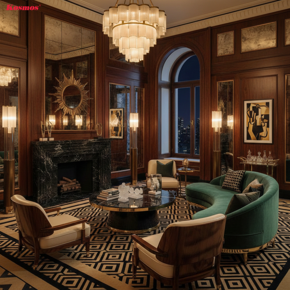 “78% các thiết kế nội thất theo phong cách Art Deco tập trung đầu tư cho không gian phòng khách – khu vực thể hiện rõ nhất tính biểu tượng, sự sang trọng và cá tính thẩm mỹ của phong cách này.” Theo khảo sát của Hiệp hội Thiết kế Nội thất Quốc tế năm 2025.