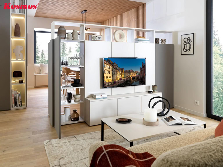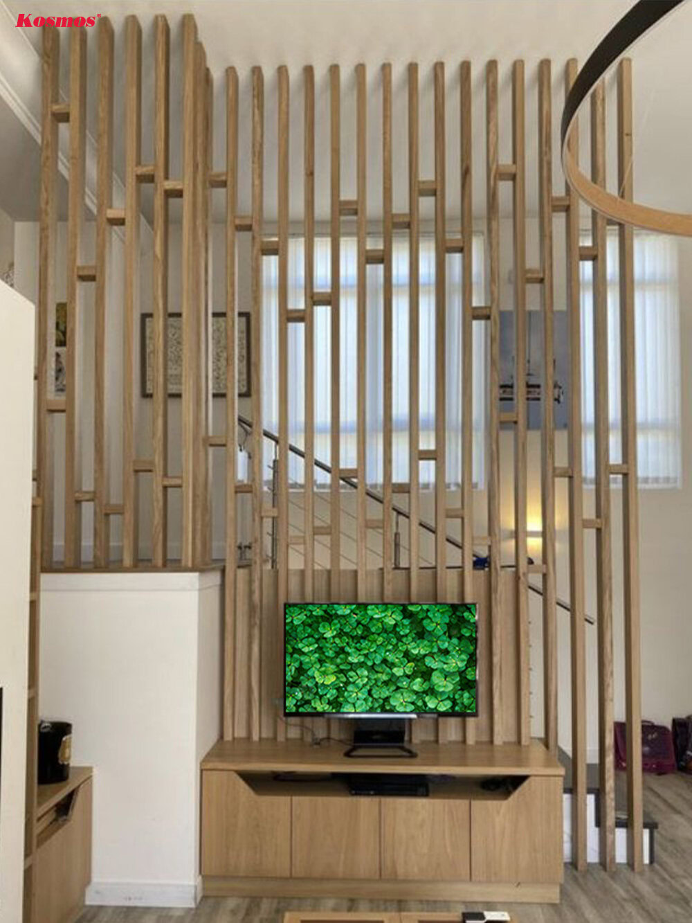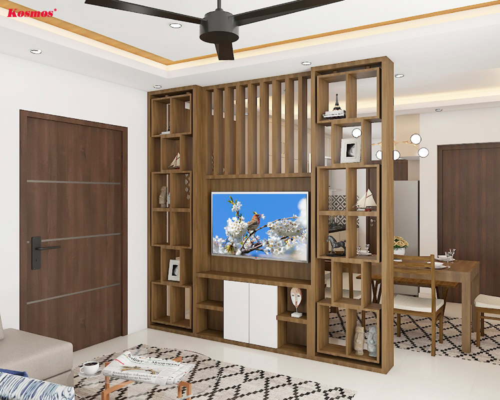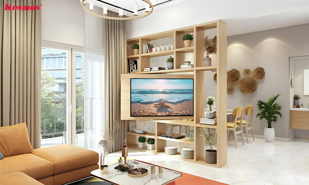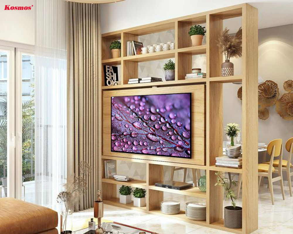 - Phân chia không gian thông minh: Vách ngăn kệ tivi giúp tách biệt các khu vực sinh hoạt trong nhà mà không làm mất đi sự thông thoáng, đặc biệt phù hợp với căn hộ có diện tích hạn chế.