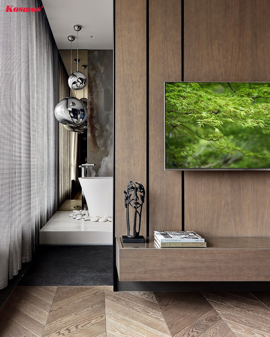 - Tính thẩm mỹ và sự hài hòa với phong cách nội thất: Vách ngăn tivi thường nằm ở vị trí trung tâm phòng khách, vì thế nó đóng vai trò như một điểm nhấn. Vật liệu ốp phải mang lại sự cân đối về màu sắc, hoa văn hoặc bề mặt hoàn thiện, giúp tổng thể không gian đồng điệu và nâng cao giá trị thẩm mỹ.