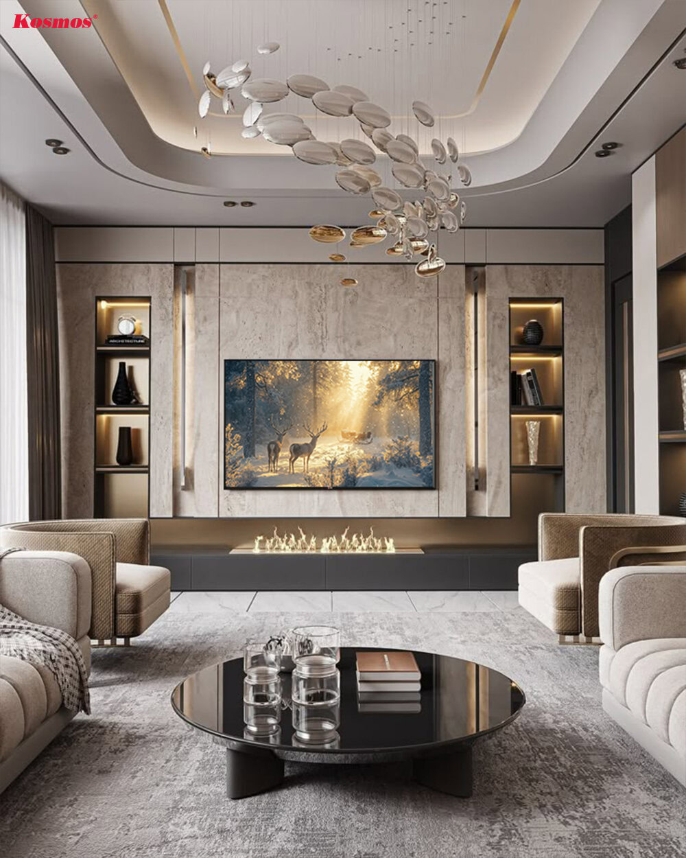 Vách tivi tân cổ điển là giải pháp trang trí phòng khách nổi bật với sự kết hợp hài hòa giữa nét sang trọng cổ điển và sự tinh gọn hiện đại. Đặc trưng của phong cách này nằm ở chất liệu gỗ hoặc đá kết hợp phào chỉ, hoa văn tinh xảo, gam màu ấm áp như trắng, kem, be, nâu, vàng ánh kim cùng ánh sáng sang trọng từ đèn chùm.