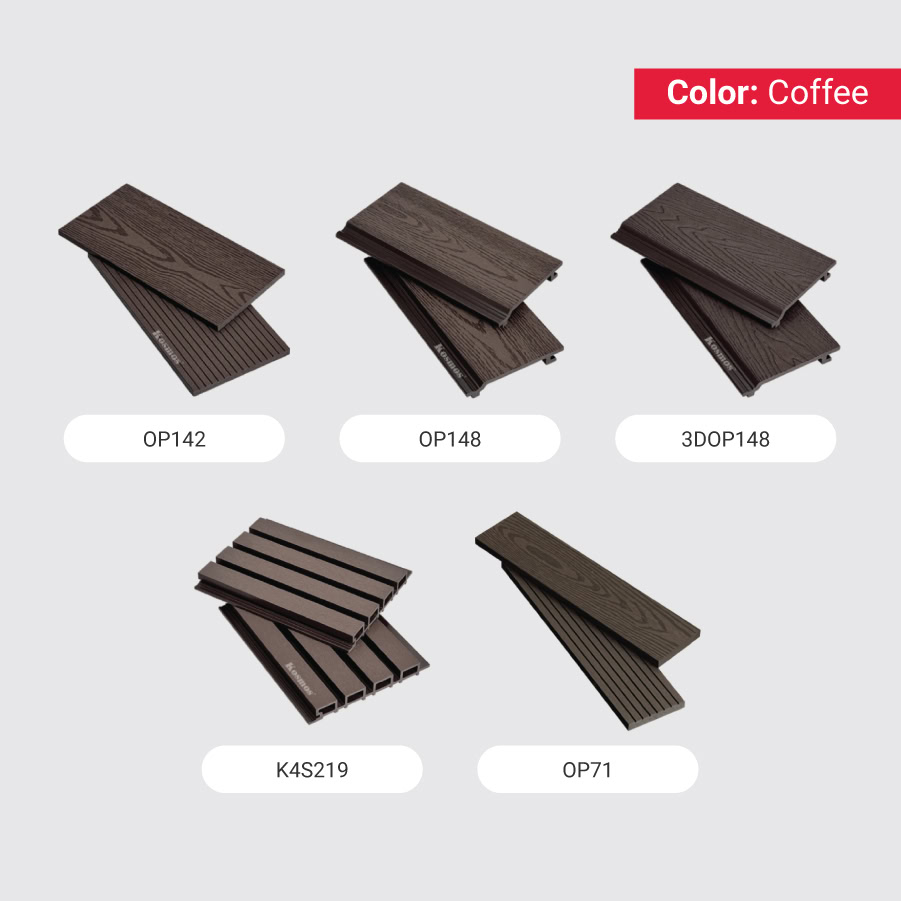 Ngoài tông màu Coffee (nâu cà phê) bộ tấm ốp gỗ nhựa ngoài trời 1 lớp Kosmos còn có các phiên bản màu sắc khác, mang đến đa dạng sự lựa chọn cho người dùng: