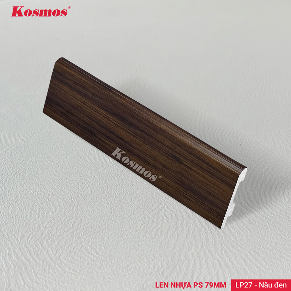 Len chân tường LP27 sở hữu tông nâu đen vân gỗ tự nhiên, thường được phối cùng sàn gỗ công nghiệp hoặc sàn nhựa giả gỗ có màu tương đồng nhằm tạo cảm giác liền mạch, gọn gàng và hài hòa cho mặt sàn.