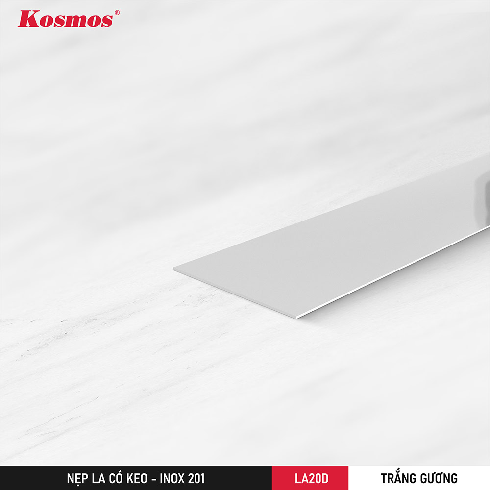 Nẹp la inox có keo dán sẵn LA20D-TG là dòng nẹp inox trang trí có bề rộng 20mm, dài 1000mm và dày 0,4mm. Sản phẩm được làm từ inox 201 cao cấp, mạ PVD màu trắng gương giúp bề mặt sáng bóng, sang trọng và giữ màu ổn định lâu dài.