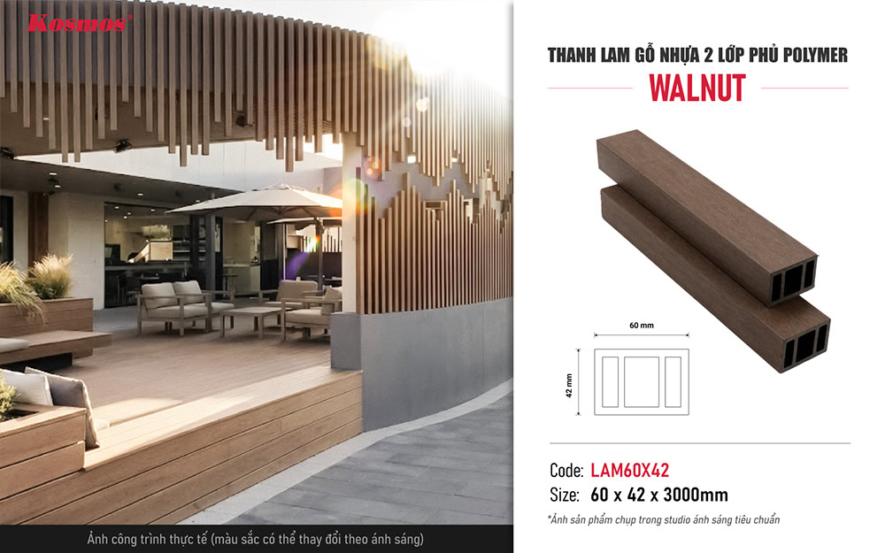 Với hơn 10 năm kinh nghiệm phân phối vật liệu trang trí, Kosmos nhận thấy thanh lam gỗ nhựa 2 lớp phủ Polymer LAM60X42 màu nâu có 3 đặc điểm nổi bật sau: