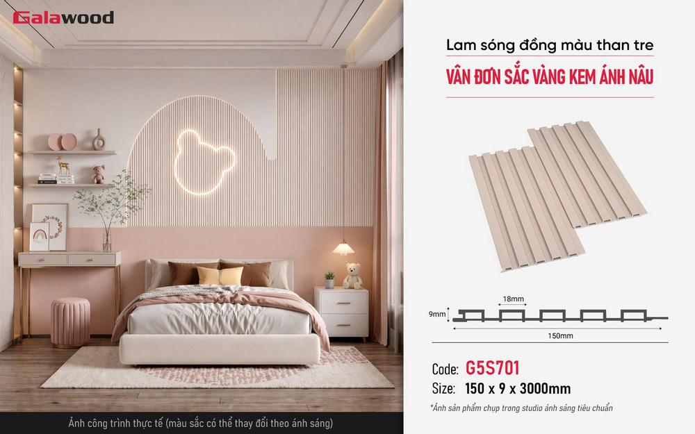 Việc đan xen này mang lại hiệu ứng phân mảng không gian cực kỳ thông minh. Tấm ốp phẳng G-701 sẽ đóng vai trò làm lớp nền nhẵn mịn, mở rộng diện tích thị giác, nhường trọn “sân khấu” cho các thanh lam 5 sóng G5S701 nhô lên làm điểm nhấn bo viền hoặc vách lam trung tâm. Vì cả hai vật liệu này đều thuộc bộ đồng màu than tre Galawood đơn sắc vàng kem ánh nâu, sự chuyển tiếp giữa mặt phẳng và mặt sóng diễn ra vô cùng mượt mà, không bị đứt gãy về mặt màu sắc, tạo nên một mảng tường đậm chất kiến trúc đương đại nhưng vẫn cực kỳ trang nhã.