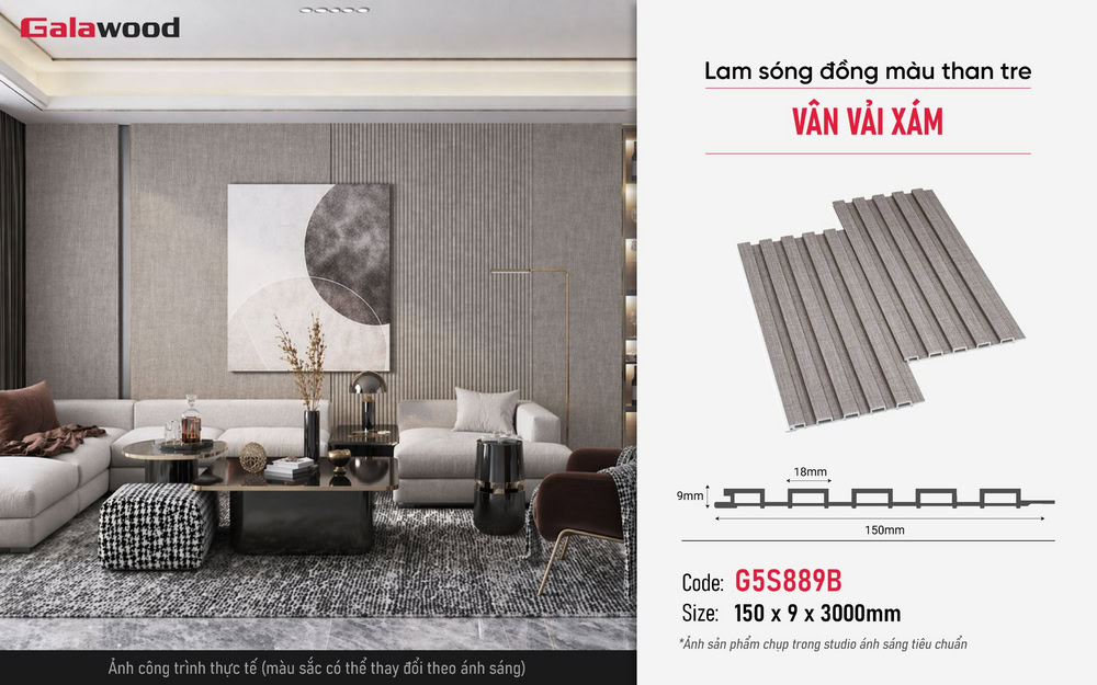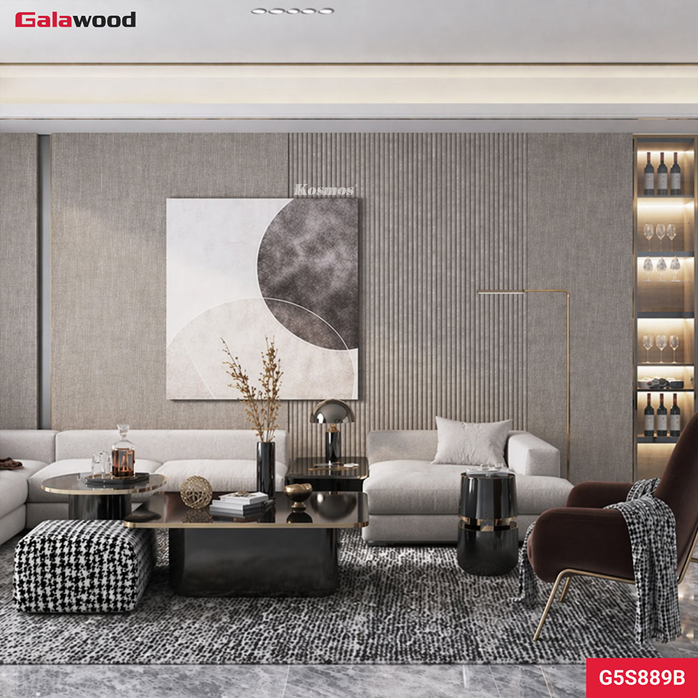 Tấm ốp lam sóng Galawood G5S889B sử dụng màng film vân vải xám để cung cấp một giải pháp ốp tường hiện đại. Sản phẩm này loại bỏ sự phức tạp của các vật liệu bọc vách truyền thống, mang lại một không gian sống gọn gàng, nam tính và đầy chiều sâu.
