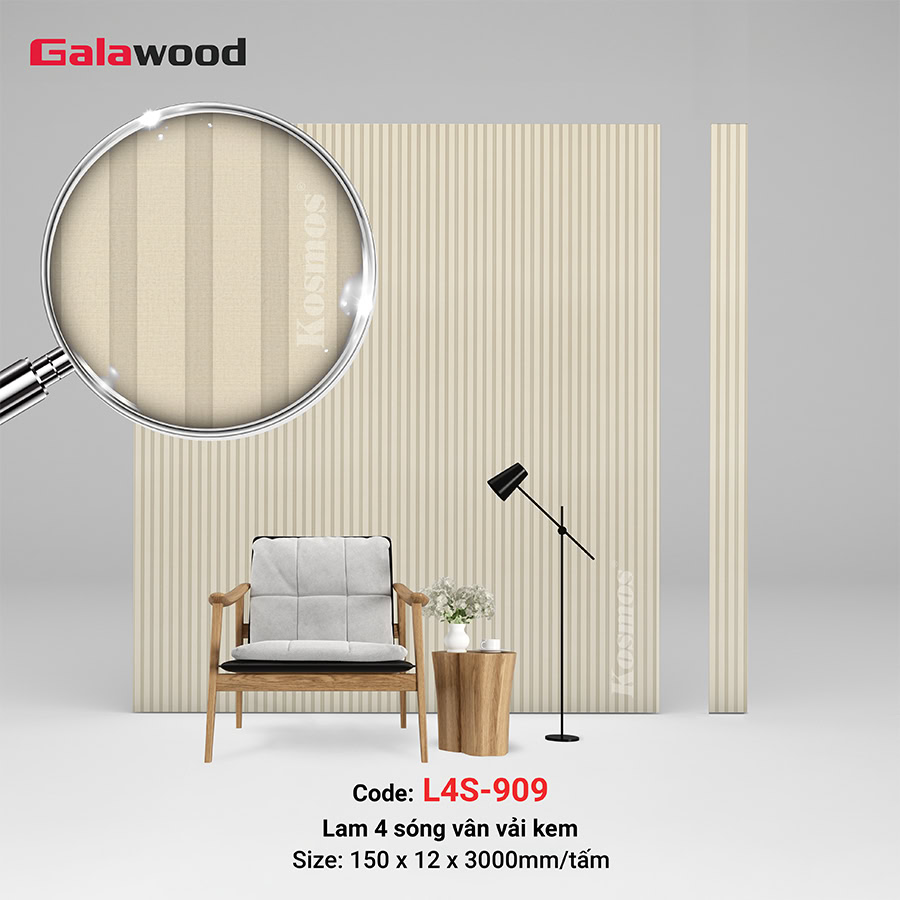 Lam 4 sóng vân vải kem L4S-909 là dòng tấm ốp lam sóng màu vân vải kem mang thương hiệu Galawood được làm từ nhựa PVC. Sản phẩm có các thông số kỹ thuật sau đây: