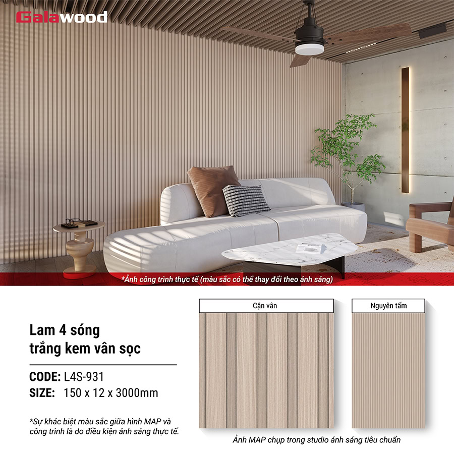Tấm ốp lam 4 sóng L4S-931 là một loại vật liệu ốp tường, ốp trần trang trí nội thất mang thương hiệu Galawood có bề mặt màu trắng kem vân sọc. Sản phẩm có bề mặt 4 sóng, tạo chiều sâu ấn tượng cho không gian. Dưới đây là các thông số kỹ thuật tiêu biểu của vật liệu này: