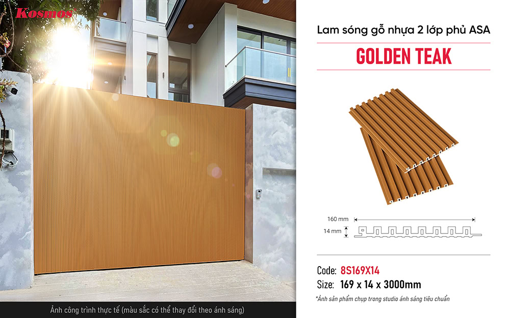 Tấm ốp lam 8 sóng phủ ASA 8S169X14 Golden Teak (vàng cam đậm) là một dòng vật liệu trang trí ngoại thất cao cấp, được sản xuất từ lớp cốt gỗ nhựa và lớp phủ ASA hiện đại ở cả mặt trên và mặt dưới, mang đến giải pháp toàn diện về thẩm mỹ và độ bền cho các công trình hiện đại.