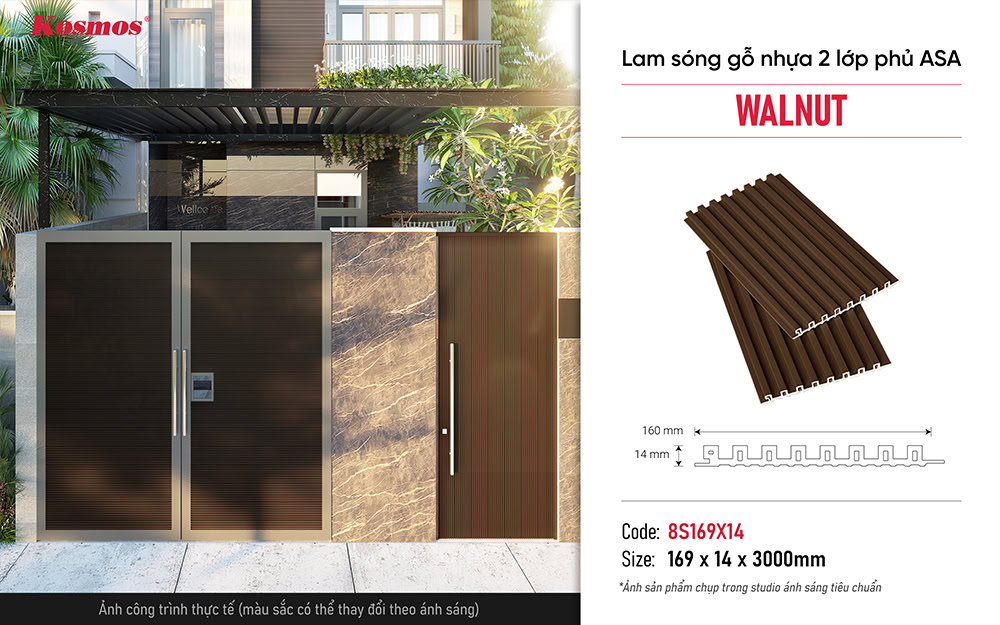 Lam sóng gỗ nhựa 2 lớp phủ ASA 8S169X14 Walnut là dòng tấm ốp trang trí ngoại thất có trọng lượng nhẹ chỉ 7,1kg/m². Sản phẩm này kết hợp hoàn hảo giữa cốt gỗ nhựa và lớp phủ bề mặt Acrylonitrile Styrene Acrylate (ASA) tiên tiến, tạo ra một giải pháp ốp tường, ốp trần trang trí lý tưởng cho các công trình hiện đại.