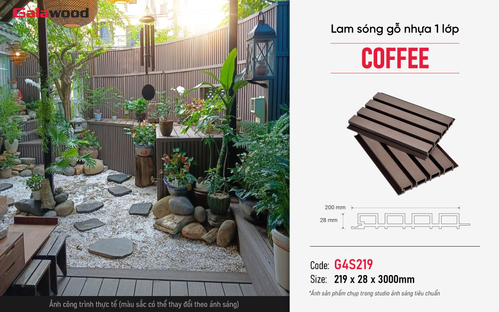 Lam sóng gỗ nhựa Galawood mã G4S219 màu Coffee được sản xuất từ 55% bột gỗ, 35% nhựa HDPE và 10% chất phụ gia tạo nên vật liệu có tuổi thọ lên đến 10 năm cùng 3 đặc điểm nổi bật như: