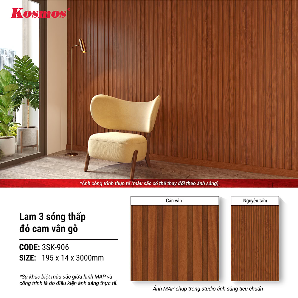 Màu sắc đỏ cam vân gỗ của lam 3 sóng thấp 3SK-906 kiến tạo nên không gian đẹp