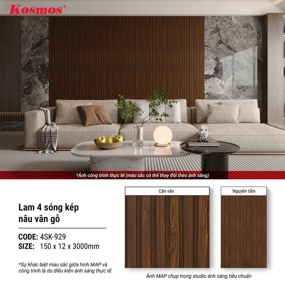 Lam 4 sóng thấp Kosmos 4SK-929 chính là giải pháp trang trí nội thất đột phá, mang đến vẻ đẹp sang trọng, ấm cúng của gỗ tự nhiên nhưng loại bỏ hoàn toàn các nhược điểm cố hữu như mối mọt, cong vênh hay chi phí bảo trì tốn kém. Đây là lựa chọn lý tưởng cho những ai đang tìm kiếm một vật liệu trang trí nội thất vừa thẩm mỹ, vừa bền bỉ.