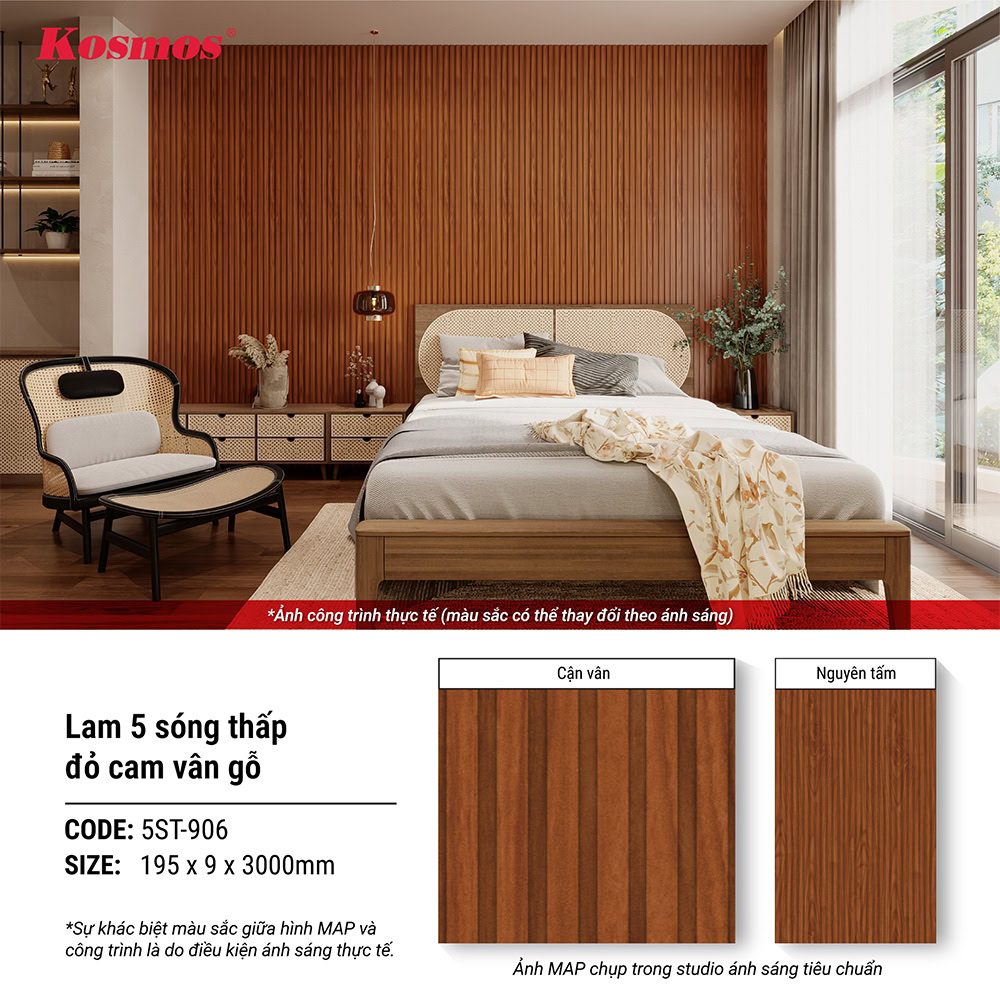 Để nhận được báo giá chính xác về lam 5 sóng thấp 5ST-906 đỏ cam vân gỗ và các giải pháp trang trí nội ngoại thất đẹp, Quý khách hãy liên hệ đến Kosmos qua số 0932 067 388 để được hỗ trợ nhanh chóng nhé.