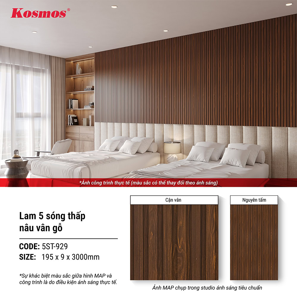 Tấm ốp lam 5 sóng thấp 5ST-929 nâu vân gỗ là giải pháp trang trí nội thất đột phá, mang đến vẻ đẹp tinh tế của gỗ tự nhiên nhưng loại bỏ hoàn toàn các nhược điểm về trọng lượng, khả năng chống mối, chống nước. Sản phẩm này đáp ứng hoàn hảo nhu cầu kiến tạo không gian sống đẳng cấp, hiện đại và tiện nghi.