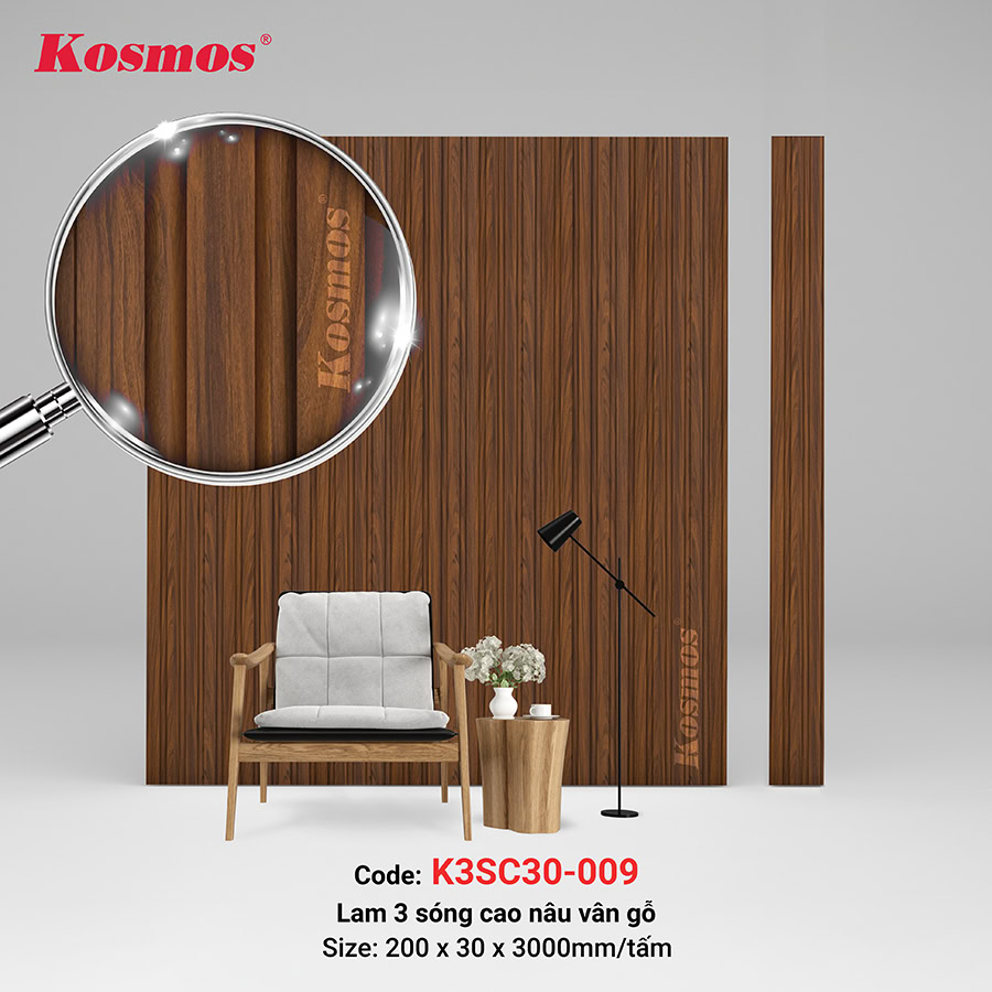 Tấm lam sóng Kosmos K3SC30-009M màu gỗ 3 sóng cao là dòng vật liệu trang trí nội thất cao cấp, được sản xuất từ nhựa PVC, không chứa chất độc hại, thân thiện với môi trường.