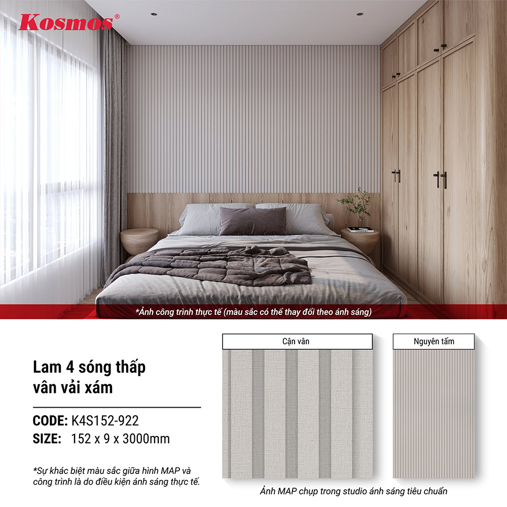 Bạn đang tìm kiếm một vật liệu trang trí nội thất vừa mang vẻ đẹp tinh tế, sang trọng của vải nhưng cứng cáp, vừa giải quyết triệt để các vấn đề về trọng lượng, độ bền và thời gian thi công? Tấm ốp lam 4 sóng Kosmos K4S152-922 vân vải xám chính là lựa chọn phù hợp, không chỉ kiến tạo một không gian sống đẳng cấp với bề mặt mô phỏng họa tiết vải xám chân thực, mà còn mang đến một giải pháp thi công thông minh và hiệu quả về chi phí.