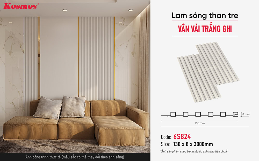 Tấm ốp lam sóng than tre vân vải trắng ghi 6S824 dễ dàng kết hợp với hầu hết các tấm ốp than tre vân vải và vân gỗ khác. Màu trắng ghi nhã nhặn của 6S824 tạo sự hài hòa, nổi bật khi đi cùng các tông màu trầm ấm của vân gỗ. Đặc biệt, tấm ốp than tre TT-824 là sự lựa chọn đồng điệu từ màu sắc đến mẫu vân.