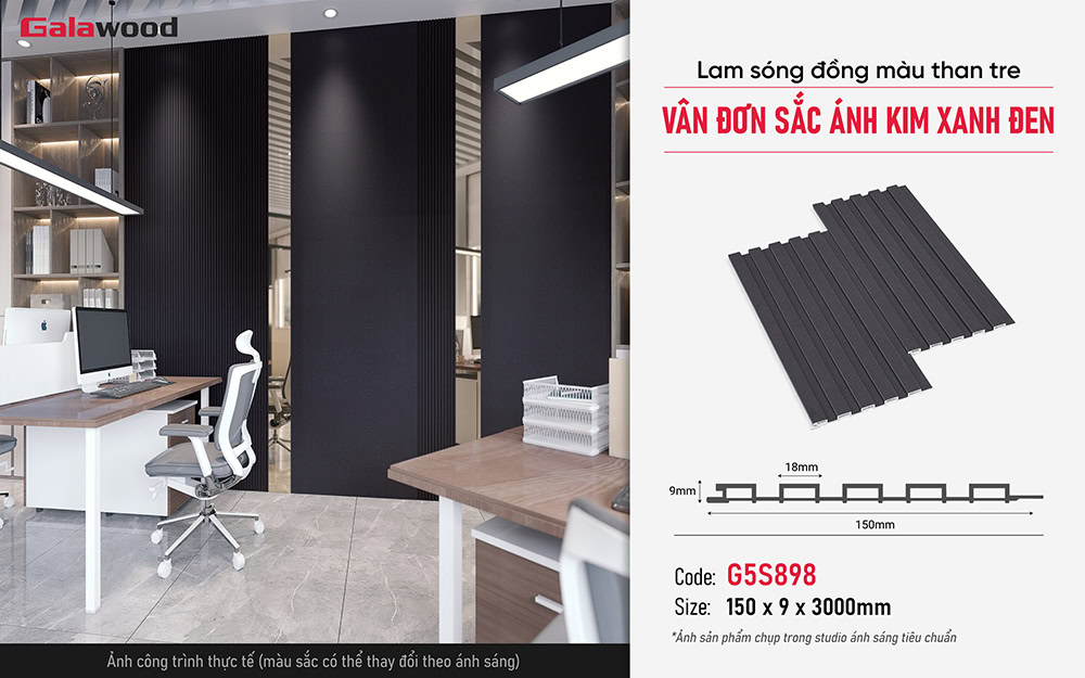 Lam sóng Galawood G5S898 được thiết kế đồng bộ với tấm ốp than tre Galawood cùng tông màu xanh đen ánh kim (mã G-898). Khi kết hợp hai sản phẩm này, bạn sẽ tạo nên một không gian nội thất đồng nhất, hài hòa và vô cùng bắt mắt.