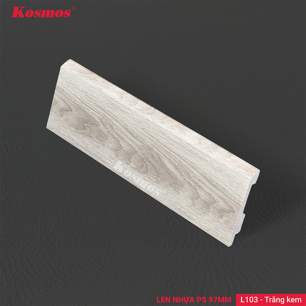 Len chân tường 97mm L103 là len nhựa PS giả vân gỗ trắng kem, chuyên dùng để che khe hở giãn nở giữa tường và sàn gỗ, sàn nhựa. Sản phẩm giải quyết trực tiếp hai vấn đề phổ biến sau khi hoàn thiện sàn: khe hở kỹ thuật mất thẩm mỹ và nguy cơ chân tường bị va đập, bong tróc sơn do bàn ghế, cây lau nhà.