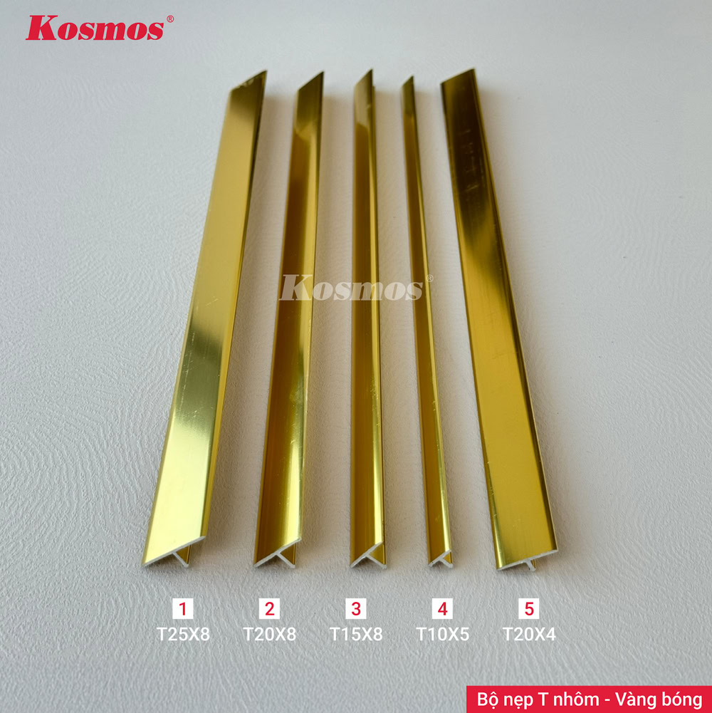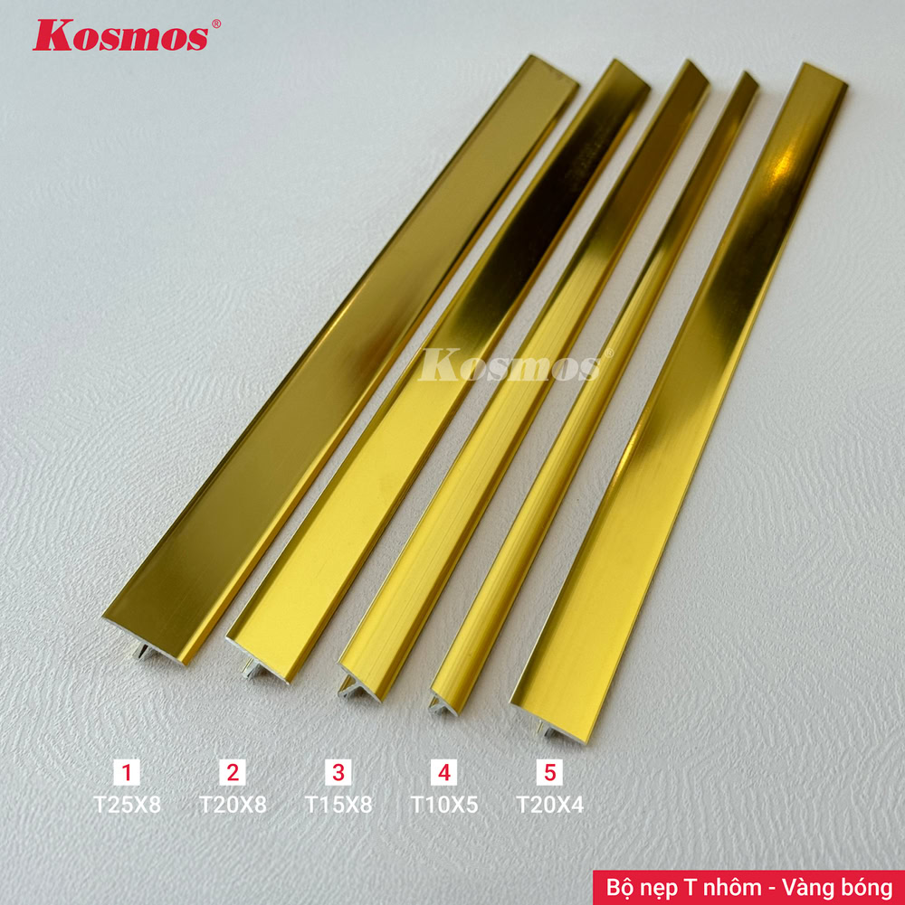 Bộ nẹp nhôm chữ T màu vàng bóng Kosmos gồm 5 kích thước: T10X5-VB, T15X8-VB, T20X4-VB, T20X8-VB và T25X8-VB, đáp ứng đa dạng nhu cầu thi công nội thất. Sản phẩm giúp che khe nối, tạo chỉ trang trí với hiệu ứng ánh kim nổi bật, mang lại vẻ hoàn thiện chỉn chu cho công trình.