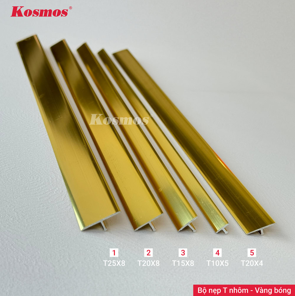 Bộ nẹp T màu vàng bóng Kosmos có những kích thước nào và ứng dụng ra sao?