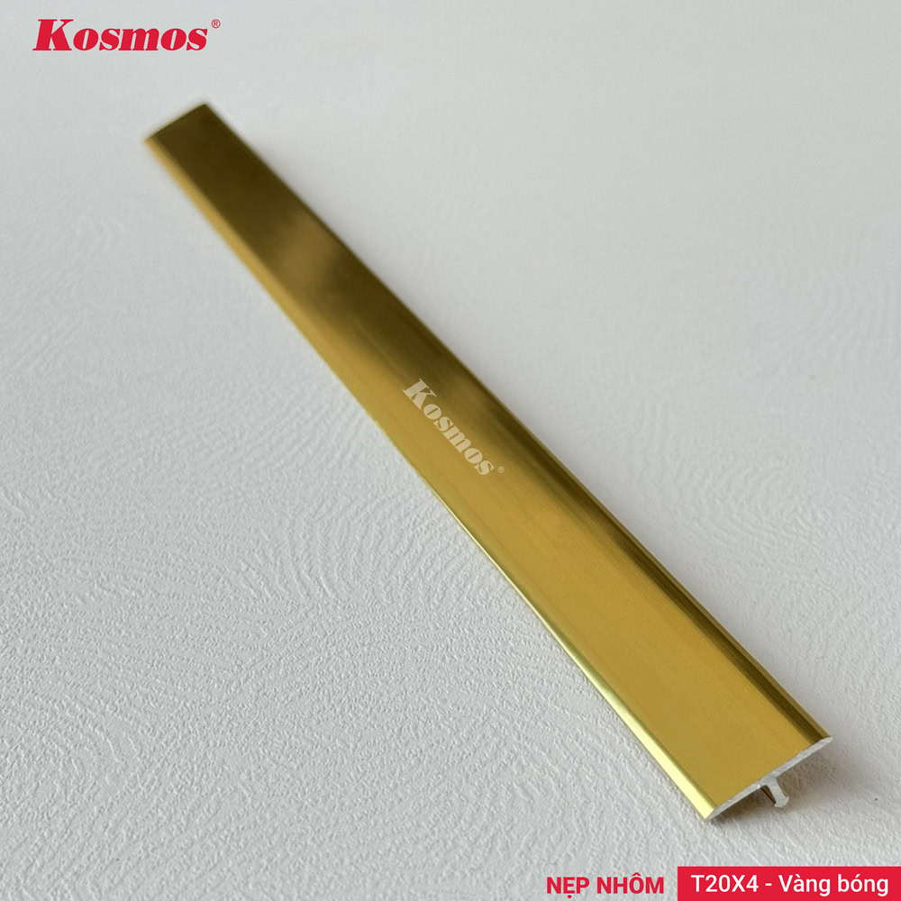 Nẹp nhôm trang trí chữ T màu vàng bóng Kosmos là phụ kiện dùng để che khe nối và tạo đường ngăn cách thẩm mỹ giữa hai vật liệu như sàn gỗ, sàn nhựa, tấm ốp tường. Bộ sản phẩm có 5 mã tiêu biểu: T10X5-VB, T15X8-VB, T20X4-VB, T20X8-VB, T25X8-VB, tương ứng với năm kích thước phổ biến.
