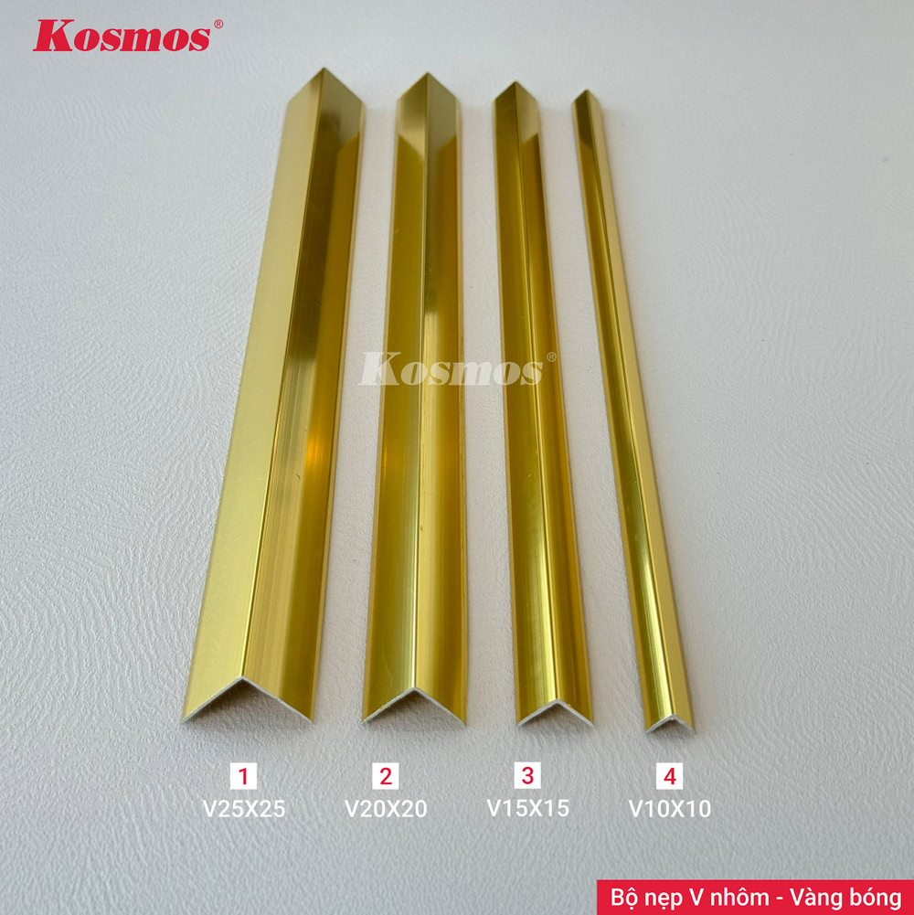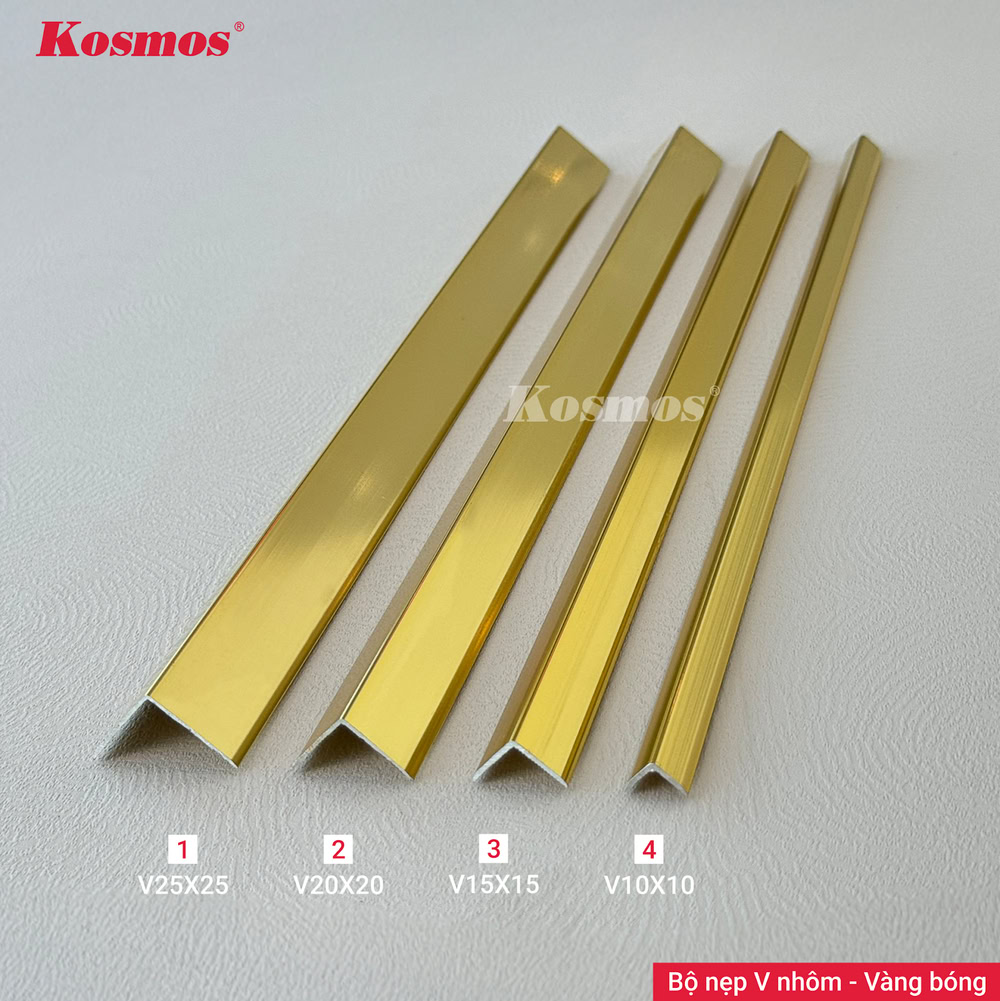 Bộ nẹp nhôm trang trí chữ V màu vàng bóng Kosmos là phụ kiện dùng để che góc, bo viền và hoàn thiện bề mặt tường, cột hoặc các chi tiết nội thất. Dòng sản phẩm này bao gồm bốn mã tương ứng với kích thước khác nhau: V10X10-VB, V15X15-VB, V20X20-VB và V25X25-VB.