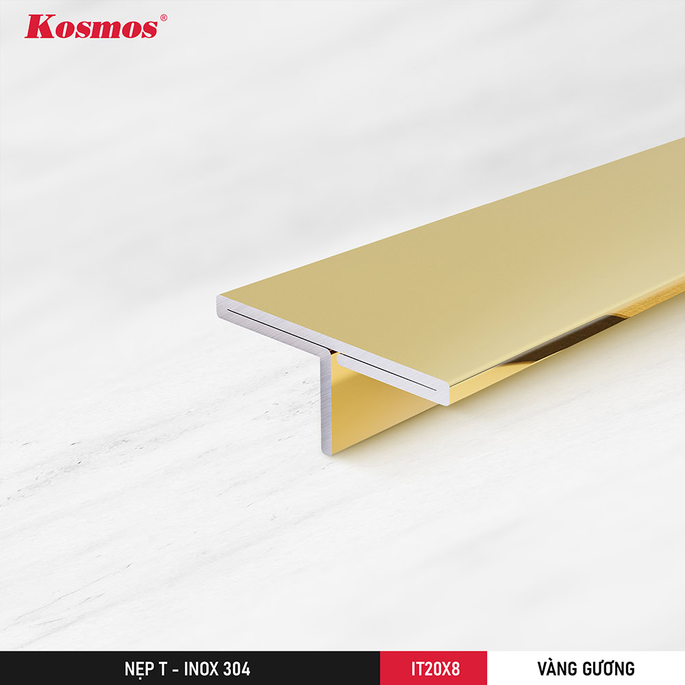 Nẹp inox t20 mạ pvd vàng gương Kosmos mã IT20X8-VG là giải pháp che khe hở và trang trí cao cấp cho không gian kiến trúc. Sản phẩm được chế tạo từ inox 304 với kích thước chuẩn 20x8x3050mm. Bề mặt vàng gương tạo điểm nhấn sang trọng và đẳng cấp cho mọi thiết kế nội thất.
