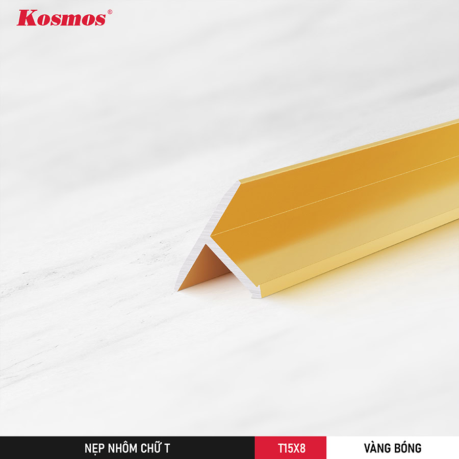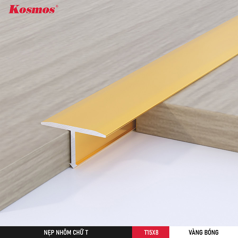 Nẹp nhôm chữ T T15X8-VB màu vàng bóng Kosmos là lựa chọn phù hợp cho các công trình cần che khe nối vật liệu 8mm và tạo chỉ trang trí ánh kim nổi bật. Với thiết kế mặt 15mm, chân 8mm, nẹp T15X8-VB góp phần mang lại sự sang trọng, tinh tế và tính thẩm mỹ bền vững cho không gian nội thất.