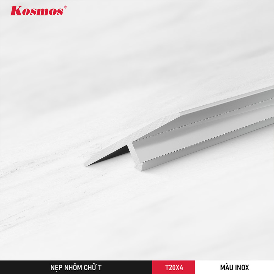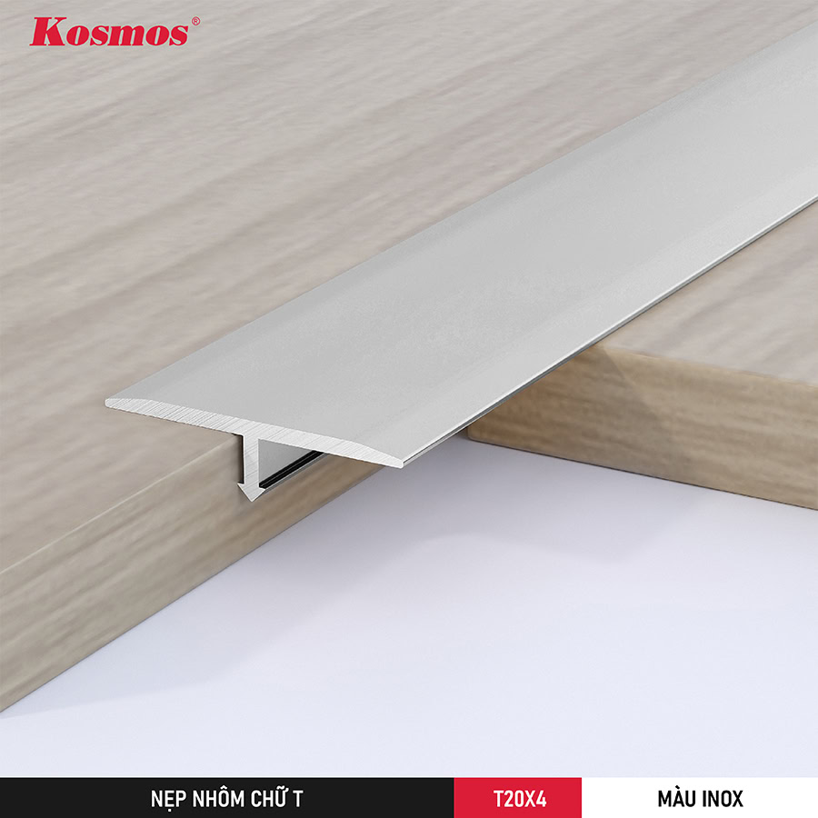 Nẹp nhôm chữ T T20X4-I màu inox Kosmos là phụ kiện dùng để che khe nối giữa các vật liệu dày 4mm, điển hình như sàn nhựa hèm khóa. Sản phẩm có mặt rộng 20mm, chân 4mm, thiết kế phẳng gọn giúp che khe giãn nở hiệu quả trên bề mặt sàn nhựa có độ dài >7m.