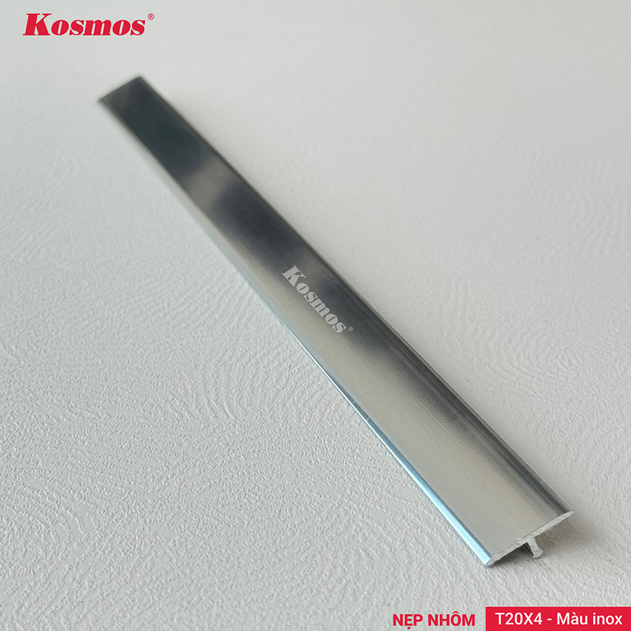 Nẹp nhôm chữ T T20X4-I màu inox Kosmos là phụ kiện lý tưởng cho công trình sử dụng sàn nhựa dày 4mm. Sản phẩm giúp che khe giãn nở, tạo chỉ inox sáng bạc, dễ thi công, bền màu, và tiết kiệm chi phí.