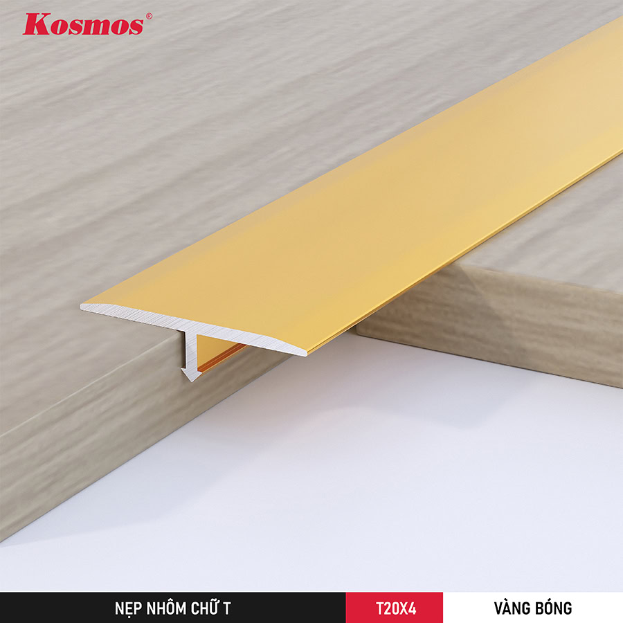 Nẹp nhôm chữ T T20X4-VB màu vàng bóng Kosmos là giải pháp phù hợp cho các công trình sử dụng sàn nhựa hèm khóa 4mm. Sản phẩm giúp che khe giãn cách tinh tế trên mặt sàn. Nhờ trọng lượng nhẹ, dễ thi công, dễ vệ sinh và chi phí hợp lý, T20X4-VB là lựa chọn đáng tin cậy để hoàn thiện không gian nội thất hiện đại với vẻ sáng kim sang trọng.