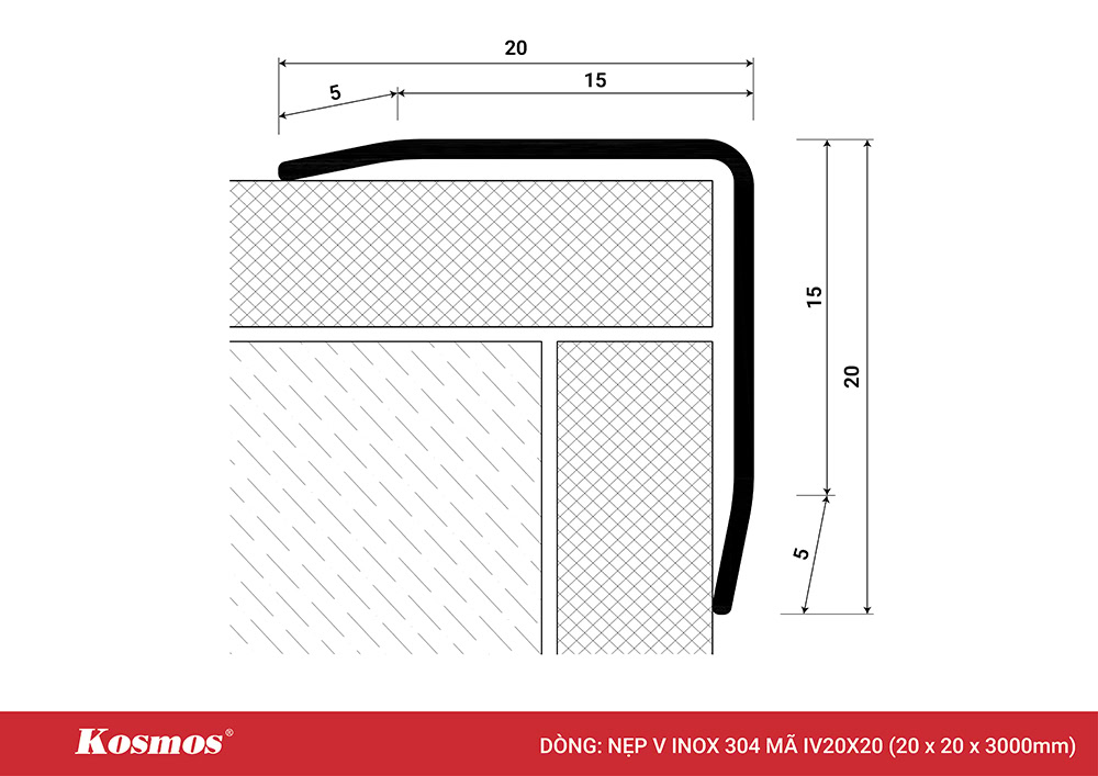 Thông số kỹ thuật nẹp v inox 20x20mm mã IV20X20-HG Kosmos