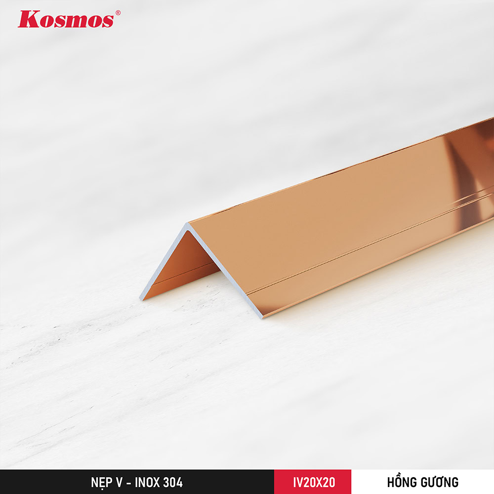 Nẹp V inox 20x20mm màu hồng gương Kosmos (mã sản phẩm IV20X20-HG) là phụ kiện trang trí nội thất cao cấp được sản xuất từ inox 304 với bề mặt mạ pvd màu hồng gương, có kích thước tiêu chuẩn 20mm x 20mm x 3050mm, được thiết kế đặc biệt để bảo vệ và trang trí góc cạnh trong không gian kiến trúc hiện đại.
