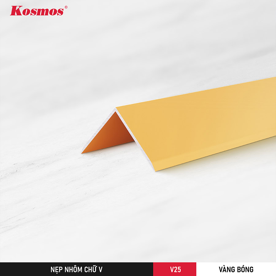 Nẹp nhôm màu vàng bóng Kosmos V25X25-VB là mẫu lớn nhất trong bộ sưu tập, tạo điểm nhấn mạnh cho cột, trụ hoặc sảnh rộng. Nhờ độ rộng 25mm cùng sắc vàng ánh gương, sản phẩm giúp đường viền trở nên rõ nét, nổi bật và bền đẹp suốt 10 – 15 năm. Nếu đang tìm giải pháp vừa sang trọng vừa tiết kiệm chi phí cho các công trình cao cấp, V25X25-VB là lựa chọn hoàn thiện đáng tin cậy.