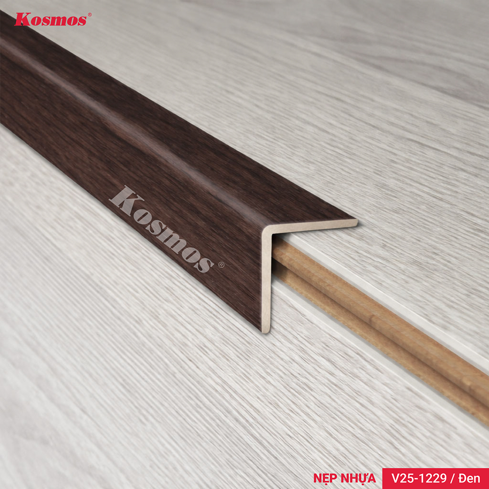 Nẹp V25-1229 màu đen là nẹp nhựa chữ V dùng để che góc vuông giữa các tấm sàn gỗ hoặc sàn nhựa. Sản phẩm thường được lắp tại hai mặt phẳng vuông góc, nhất là mũi bậc thềm, giúp xử lý phần mép sàn sau khi thi công.