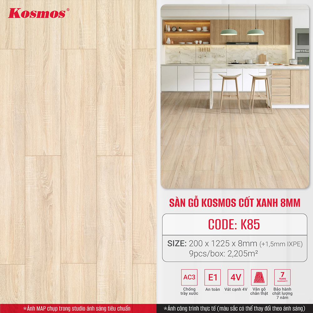 - Cốt xanh kháng ẩm: Sàn gỗ Kosmos K85 sử dụng cốt gỗ xanh được xử lý đặc biệt, giúp tăng cường khả năng chống ẩm, phù hợp với điều kiện khí hậu nóng ẩm của Việt Nam.