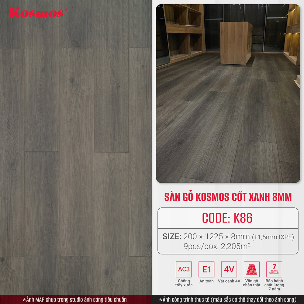 Sàn gỗ Kosmos cốt xanh K86 là sự lựa chọn hoàn hảo cho những ai đang tìm kiếm một loại sàn gỗ chất lượng cao, bền đẹp và an toàn cho sức khỏe.