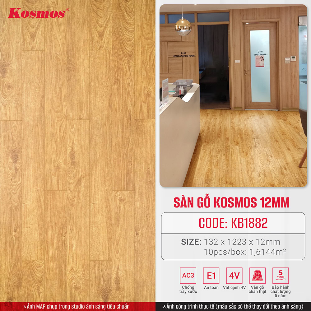 Sàn gỗ Kosmos 12mm KB1882 là sản phẩm sàn gỗ công nghiệp được sản xuất tại Việt Nam trên dây chuyền công nghệ hiện đại của Châu Âu. Sản phẩm có nhiều ưu điểm nổi bật như:
