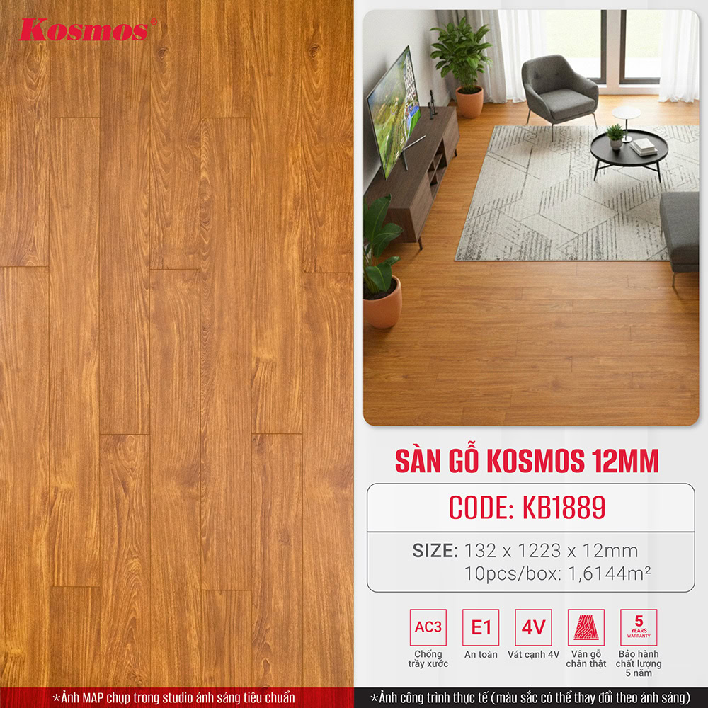 Sàn gỗ Kosmos 12mm KB1889 là một sản phẩm chất lượng cao, phù hợp với những khách hàng yêu thích vẻ đẹp tự nhiên, sang trọng. Sàn gỗ mang đến cho không gian sống vẻ đẹp ấm cúng, gần gũi và đẳng cấp.