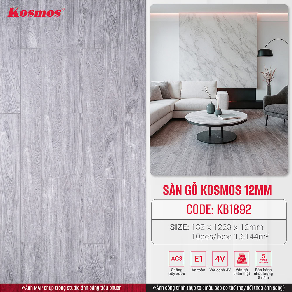- Giá thành hợp lý: Sàn gỗ Kosmos 12mm KB1892 có giá thành hợp lý, phù hợp với túi tiền của nhiều gia đình Việt.
