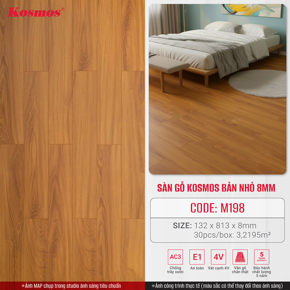 - Vẻ đẹp sang trọng, hiện đại: Sàn gỗ Kosmos M198 có màu sắc vân gỗ vàng cam, tinh tế, mang đến vẻ đẹp sang trọng, hiện đại cho không gian sống của bạn.