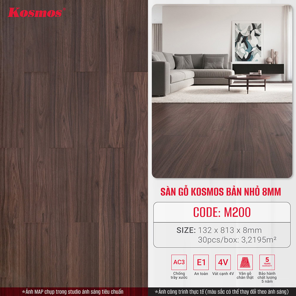 Một trong những sản phẩm nổi bật của Kosmos là sàn gỗ Kosmos M200. Nếu Quý Khách có nhu cầu, đừng ngần ngại liên hệ với chung tôi qua (+84) 903 093 221 để được tư vấn và hỗ trợ nhanh nhất nhé.