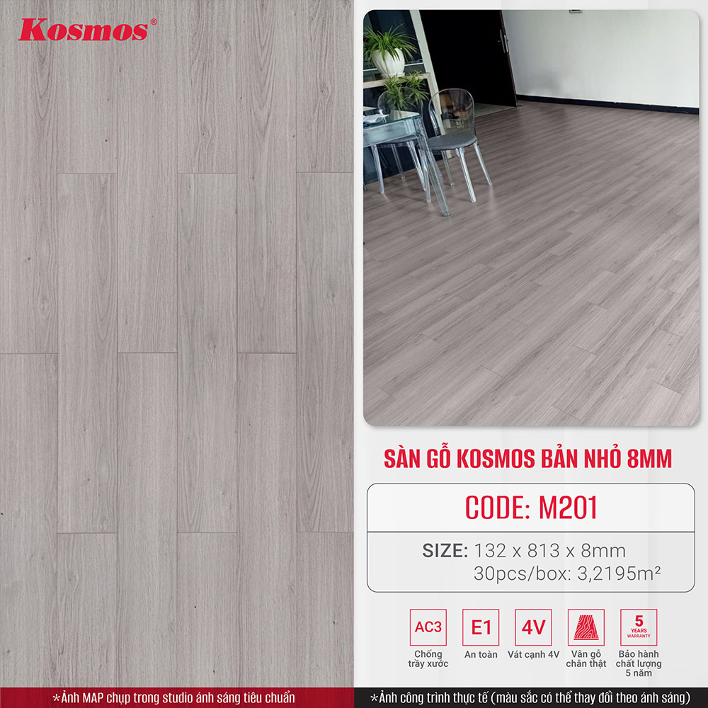 - Vệ sinh sàn gỗ: Sàn gỗ Kosmos M201 cần được vệ sinh thường xuyên bằng các chất tẩy rửa chuyên dụng, tránh sử dụng các chất tẩy rửa có tính axit, kiềm mạnh.