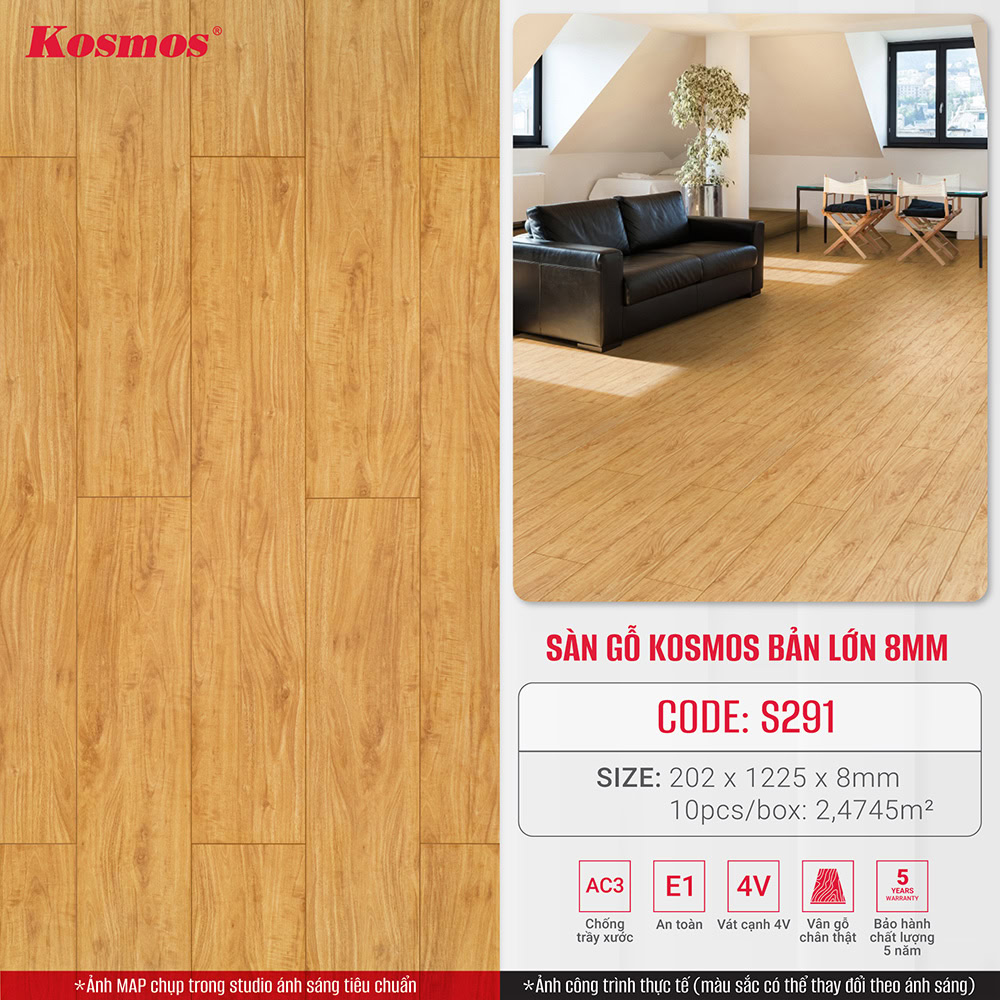 - Mẫu mã đẹp: Sàn gỗ Kosmos S291 có màu vàng sồi đậm tươi sáng, mang đến vẻ đẹp sang trọng và hiện đại cho không gian sống.