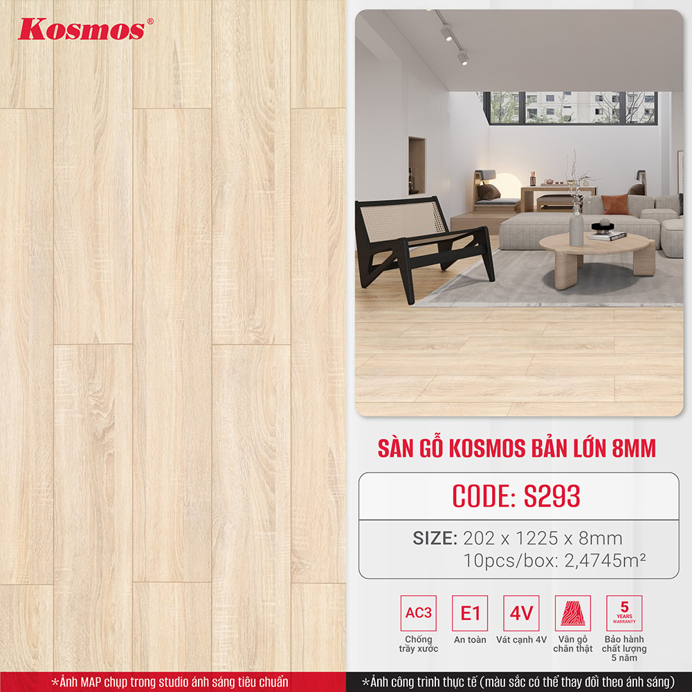 Sàn gỗ công nghiệp Kosmos S293 là sản phẩm chất lượng cao, giá thành hợp lý, phù hợp với nhu cầu sử dụng của nhiều gia đình Việt. Nếu bạn đang tìm kiếm một dòng sàn gỗ giá cả phải chăng, chất lượng tốt thì sàn gỗ Kosmos S293 là một lựa chọn đáng
